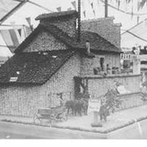 Postcard photo, black and white: 1910 Gravenstein Apple Show exhibit of the Pleasant Hill fruit Evaporator (dryer) made of whole and dried apples as seen from a different angle. Exhibit in huge tent of the apple show. The Pleasant Hill dryer was located at the current (2010) Southpoint Avenue.