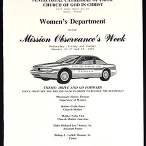Mission observance’s week program, "Drive and go forward", Women's department, Pentecostal Cathedral of Faith Church of God in Christ, Waco, Texas, 1995 January 25-27 & 29. [Description English/roman)]