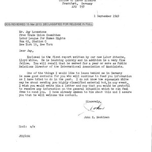 Meskimen letter to Lovestone, with attached Lloyed White memo regarding impressions of Berline and the West Zone of Germany
