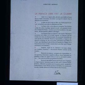 Le general d'armee, commandant en chef, delegue general et plenipotentiaire de la France libre au Levant. Beyrouth, le 19 janvier 1942. Directive morale. La France libre fait la guerre: Aidee de ses vingt-six allies, elle lutte pour retablir la France dans ses limites territoriales, lui restituer son rang et la restaurer dans la plenitude de sa souverainete
