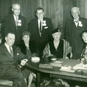 Mr. and Mrs. Whitsett and five unidentified people in the office of Arthur D. Aston; Valley Federal Savings and Loan.