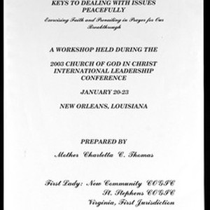 Church of God in Christ (COGIC), leadership conference workshop guide, "Keys to dealing with issues peacefully", New Orleans, Louisiana, 2003 January 20-23. [Description English/roman)]