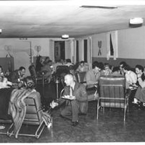 Photo--black and white: Robert Brabec at center of photo kneeling talking with two seated women. A large group of men and women eating in what appears to be a racket club as there are many rackets displayed on the walls. Circa 1950s.