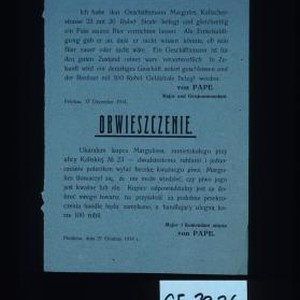 Bekanntmachung. Ich habe den Geschaftsmann Margules ... mit 20 Rubel Strafe belegt und gleichzeitig ein Fass saures Bier vernichten lassen. Als Entschuldigung gab er an, dass er nicht wissen koonte, ob sein Bier sauer oder nich ware. Ein Geschaftsmann ist fur den guten Zustand seiner Ware verantwortlich. In Zukunft wird ein derartiges Geschaft sofort geschlossen und der Besitzer mit 100 Rubel Geldstrafe belegt werden. Major und Ortskommandant von Pape. Petrikau, 27 Dezember 1914