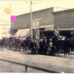 Photo--black and white: Bodega Avenue with Main Street seen at the left. A funeral procession is stopped for the photograph. The group of Asian men are by the front wagon, and Edward F. O'Leary is seen in front of the horse. O'Leary owned E. F. O'Leary Funeral Parlor which was located to the right of the Naumann Paint Store sign (behind the wagon).