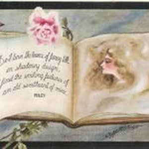 Postcard--colored picture: Open book with poetry and portrait of lady. Hearts and roses around book. Handwritten message on back to Mary Guisler (Brain)