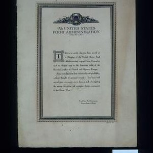 The United States Food Administration. This is to certify that you have served as a member of the United States Food Administration from December 1918 to August 1919 in the American relief of the liberated peoples of Central and Eastern Europe