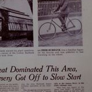 Slide--black and white: Luther Burbank on his bicycle near his home in Santa Rosa. Caption reads: "Luther Burbank was a familiar figure on his bicycle and was addicted to fast traveling on the wheel." Circa 1915