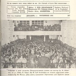 The Christian Herald was an informational organ of the Union of Pentecostal churches of "Assemblies of God" in South America. The journal was founded in August 1937 at the founding meeting of the Slavic Pentecostal churches of South America. Believers from Argentina, Paraguay, Uruguay and Brazil were present at the meeting. The purpose of the journal was to "carry unity and communication of the Spirit to the midst of believers in full Gospel". The journal united Pentecostal churches and became a link which connected believers scattered all over the world. Thus, letters of Christians of Evangelical faith from Germany, Belgium, France, the Netherlands, Canada, the United States, Uruguay, Paraguay, the Philippines, China, Australia and other countries were published in the journal journal. The first issue was published in Russia in October 1937. Subsequently, the journal spread to 40 countries where the Slavic diaspora lived. The headquarters of the journal was located in Buenos Aires. Juan Zub-Zolotarow was responsible for the journal. He was a permanent editor for 42 years. The journal was published for offerings of believers. Spiritually-edifying and theological articles of Donald Gee, Alfred Goets, R. Bratslavsky, N. Vodnevsky, D. Bespalov were published in the journal. On the last pages, as a rule, information from local churches and the mission and evangelical fields of North and South America, Canada, Africa, Australia, India, Europe and China was published. Thus the activity of such evangelists as Oral Roberts, Billy Graham, T. Giks, and William Brankham was reported in detail. [Description English/roman)] Христианский Вестник -- информационный орган Союза Пятидесятнических церквей «Собраний Божиих» Южной Америке. Журнал был основан в августе 1937 года на учредительном собрании славянских пятидесятнических церквей Южной Америки. На этом съезде присутствовали верующие с Аргентины, Парагвая, Уругвая и Бразилии. Цель журнала: «Нести единство и общение духа между верующими в полное Евангелие». Журнал объединил вокруг себя пятидесятнические церкви и стал как-бы связующим звеном между верующими, рассеянными по всему миру, публикуя письма христиан веры евангельской-славян из Германии, Бельгии, Франции, Голландии, Канады, Соединенных Штатов, Уругвая, Парагвая, Филиппин, Китая, Австралии и других стран. Первый номер журнала, издававшегося на русском языке, вышел в октябре 1937 года. Впоследствии журнал распространялся более чем в 40 странах, где проживала славянская диаспора. Штаб квартира журнала находилась в Буэнос-Айресе. Ответственным за журнал был назначен И.Зуб-Золоторев, который и был бессменным редактором на протяжении 42-х лет. Издавался журнал на добровольные пожертвования верующих. В журнале печатались духовно-назидательные и богословские статьи Дональда Джи, Альфреда Гоетца, Р.Брацлавского, Н.Водневского, Д.Беспалова. На последних страницах, как правило, публиковались информационные сообщения от поместных церквей и евангелизационных и миссионерских полей Северной и Южной Америки, Канады, Африки, Австралии, Индии, Европы и Китая. Так освещалась подробно деятельность евангелистов: Орала Робертса, Билли Грэма, Т.Гикса, Уилльяма Бранхама. [Description (original non-English/roman language/script)]
