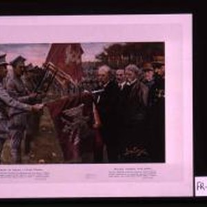 Remise des drapeaux a l'armee polonaise. Raymond Poincare, president de la republique francaise, decore le drapeau des volontaires polonais de 1914, apres la remise des drapeaux offerts par les villes de Paris, Belfort, Nancy et Verdun a l'armee polonaise