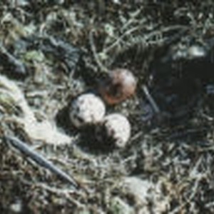 Three eggs - two white and brown speckled and one almost completely brown - at Scammon's Lagoon, Shell Island.