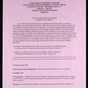 Auxiliaries in Ministry (AIM), Church of God in Christ (COGIC), Scholars fellowship academic forum, Tampa Convention Center, Tampa, Florida, 2009 June 30 - July 2. Pink copy. [Description English/roman)]