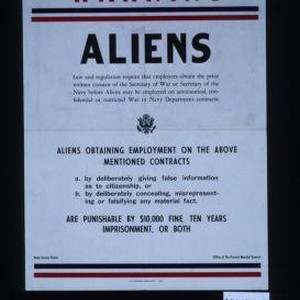 Warning. Aliens. Law and regulation require that employees obtain the prior written consent of the Secretary of War ... before aliens may be employed on aeronautical, confidential or restricted War or Navy contracts