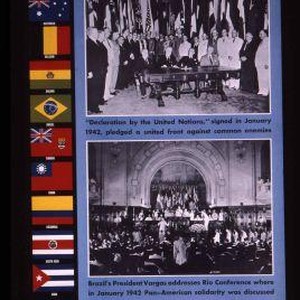 We are United Nations. "Declaration by the United Nations," signed in January, 1942, pledged a united front against common enemies. Brazil's President Vargas addresses Rio Conference where in January 1942 Pan-American solidarity was discussed. Teamwork for victory