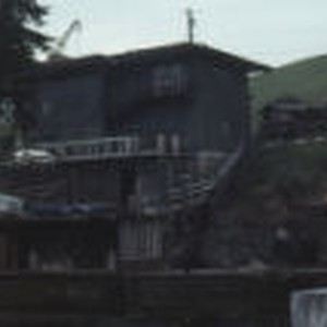 Small industrial building with small boats stacked up and a small crane, with rolling green hills in the background.
