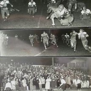 Photo--Black and white: Analy High School Football fall1951. Three photos--two photos during the game with Santa Rosa and bottom photo the Analy bleachers with fans, cheerleaders and Analy Band to the right.