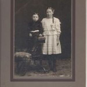 Photo--black and white, studio matted: Clifford Sharp, age 3 1/2 and Gertie Sharp, age 10 in a studio portrait. They are children of Mr. & Mrs. Earl Sharp. Shaw Studio 647 Cherry St. Santa Rosa, CA