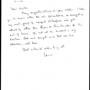 Letter of correspondence to Charles Handy from Ian Skeet expressing congratulations to Charles Handy on his C.B.E. Skeet proceeds to state that he hopes Handy will remain either the role representative, or amongst a very small group, of management philosophers who get noticed by royalty or government officials. He closes the letter wishing Handy the best in the new millennium.