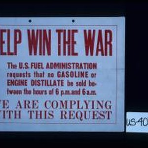 Help win the war. The U.S. Fuel Administration requests that no gasoline or engine distillate be sold between the hours of 6 p.m. and 6 a.m. We are complying with this request