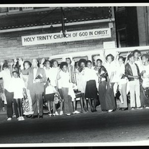 2 photographs of a group of students and others in front of a van, Holy Trinity Church of God in Christ, Chicago, Illinois, [s.d.]. From Corby Bush? [Description English/roman)]