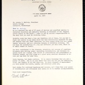 David H. Wicks (Mississippi Valley State College), Itta Bena, Mississippi, letter, 1974 April 16, to Arenia C. Mallory (Saints College), Lexington, Mississippi. [Description English/roman)]
