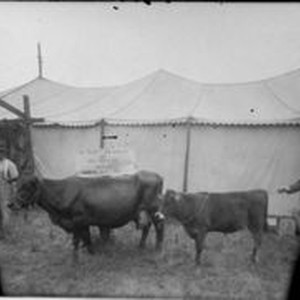 Negative glass-plate photo: From a glass plate negative made by William Borba. Gravenstein Apple Show circa 1915 in Sebastopol. Two men and a cow and her calf with exhibition tent behind. Sign caption: "Old Kitty--24 years old and her 22nd calf produced 600lbs. B.F.(butter fat)--19th yr."
