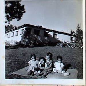 Photo, black and white: The four children of Boone and Zenaida Hallberg, L-R: Juana Esther, Tommy, Maria and Oscar Hallberg. December, 1965 in Oaxaca, Mexico.