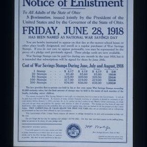 Notice of enlistment. To all adults of the State of Ohio: A proclamation, issued jointly by the President of the United States and by the Governor of the State of Ohio. Friday, June 28, 1918 has been named as National War Savings day. ... The money invested in War Savings Stamps is not a gift, or a donation, but a loan to the government. ... The government of the United States expects all citizens to pledge themselves [signed] H. P. Wolfe, War Savings Director