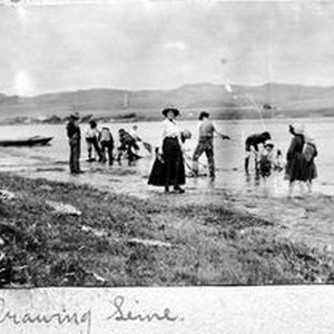 Photo--black and white: Seining (net) fishing, possibly at Bodega Bay area. From Sebring / Allen album.