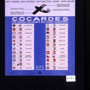 Defense passive. Les signes militaires distinctifs sont appliques: au corps de l'avion, cote superieur des surfaces portantes, cote inferieur des surfaces portantes, gouvernail de direction. Cocardes des avions militaires des etats europeens: Allemagne, Belgique, Danemark, [&c., &c.] ... Une defense aerienne est indispensable