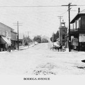 Photo--black and white: Bodega Ave in Sebastopol looking west in 1906. On south corner--Walker Building--Jim O'Malley's Tavern, Sebastopol Grammar School. On west side: Fire department building (was previously Spring Hill's Cumberland Presbyterian Church).