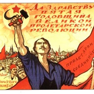 A poster dedicated to the 5th anniversary of the Great October Revolution (Bolsheviks' revolution) in Russia in 1917. Caption reads, "Da zdravstvuet piataia godovshchina velikoi proletarskoi revoliutsii! Chetvertyi kongress kommunisticheskogo internatsionala / Да здравствует пятая годовщина великой пролетарской революции! Четвёртый конгресс коммунистического интернационала", meaning, "Long live the fifth anniversary of the great proletarian revolution! The fourth congress of the Communist International". [Description English/roman)]