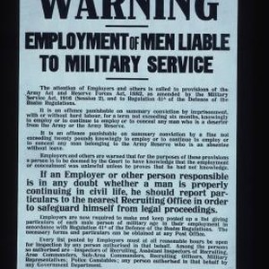 Warning. Employment of men liable to military service. ... It is an offence punishable on summary conviction by imprisonment, with or without hard labour, for a term not exceeding six months, knowingly to employ or to continue to employ or to conceal any man who is a deserter from the Army or the Army Reserve. ... [or] any man belonging to the Army Reserve who is an absentee without leave