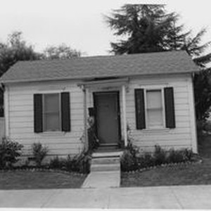Photo, black and white: Sebastopol house at 7169 Burnett Street a cottage built in 1905 in the Burnett Addition. House photographed in 1993 by Evelyn McClure for her book "Sebastopol, California : History, Homes and People."