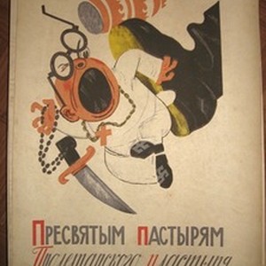 An antireligious poster. Caption reads, "Presviatym pastyriam proletarskogo plastyria / Пресвятым пастырям пролетарского пластыря", meaning, "A proletarian kick for the holy father". [Description English/roman)]