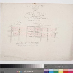 3 copies of same basic map: one copy has notes re: certification with George Hansen's name crossed out, dirt on middle of top; ; edge; third copy is skewed to top edge with red ink blot in the middle of the subdivision; second copy has some pencil lines extending beyond the subdivision. Reduced from the scale of the original map of 1 : 80 ft.. Grasshopper to Hope St., Temple to Fifth St.. Alt title supplied by cataloger.