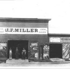 Photo--black and white: The J. F. Miller blacksmith shop in Sebastopol circa 1880s to 1890s. Three men stand in the entrance to the shop. The center man wears a three-piece suit and may be the owner. The signs advertise practical horseshoers, general blacksmith and plow points ground. Sign painted by Corts. Per Harold Pellini the store was located at the current location of Sebastopol Auto Body at 351 Petaluma Avenue( formerly Chiaroni Dodge Plymouth).