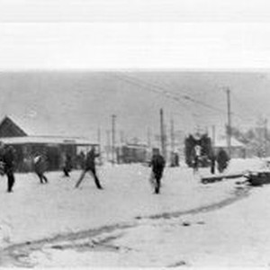 Photo--black and white: A snowball fight across from P&SR station in Sebastopol, January 1908.