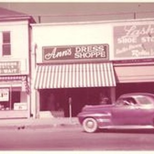 Photo--color, Kodacolor: The storefront of Ann's Dress Shoppe on the west side of Main Street Sebastopol, 1956. Lash's Shoe Store is seen to the right and Elite Cleaners to the left.