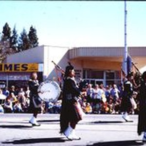 Print, color: Apple Blossom Parade, annual Sebastopol spring event. The Sonoma County Sheriff's Pipe Band marching in the parade. Gary Kimes for 2nd District Assemblyman sign on building. Glendale Federal Savings Bank to right.