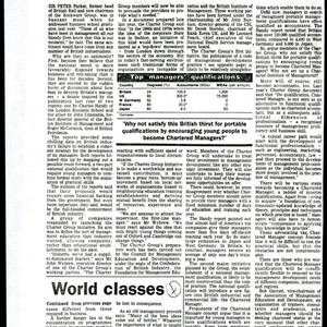 Michael Skapinker article on the Charter Group debate featuring Charles Handy's report. According to the article, graduates of British business schools have reason to be optimistic about the current British economy. Skapinker indicates that this optimism is warranted for two reasons. First, because graduates believe the national mood is more favourably disposed towards business and risk-taking than it has been in decades. Second, they are excited by the prominent discussion about how best to develop Britain's managers, where the thought and research of Charles Handy comes into play. In response to such positive research and discussion, a group of companies responded by launching the Charter Group Initiative. The Charter Group plans to treat their investment in management development like any other strategic investment and to keep their managers fully informed of the development opportunities on offer. Additionally, the Group plans to establish a national management qualification, which would introduce the Chartered Manager into British industrial life. The debate centers on the advisability of encouraging young people to become Chartered Managers.
