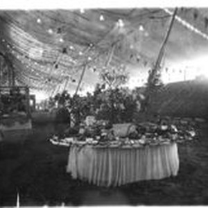 Photo -black and white: Laura E. Barlow Exhibit at Gravenstein Apple Show 1915. Exhibit is under huge tent that was set up on S. Main Street in Sebastopol where the post office is now located. Growers from the county would exhibit their apples, berries and fruits. Laura E. Barlow was the widow of Thomas E. Barlow who established a large berry and apple farm in Sebastopol.