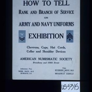 How to tell rank and branch of service on Army and Navy uniforms. Exhibition. Chevrons, caps, hat cords, collar and shoulder devices. American Numismatic Society