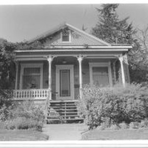 Photo, black and white: Sebastopol house at 734 Litchfield Avenue a Queen Anne cottage built in 1895 in the Wightman Addition. House photographed in 1993 by Evelyn McClure for her book "Sebastopol, California : History, Homes and People."