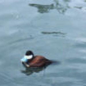 Close-up of male red and black duck with a blue bill in a pool of water.