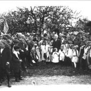 Photo, Black and white: Luther Burbank in center of photo holding a young tree surrounded by a group of children--several of the children are holding American flags. Photo was taken March 7, 1921 in Santa Rosa celebrating Arbor Day. In 1909 the state of California designated March 7--Luther Burbank's birthday--as the state's Arbor Day.