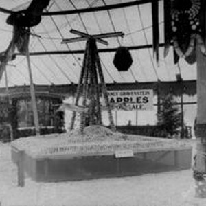 Photo--black and white, from Borba 8" x 10" celluloid negative: Gravenstein Apple Show display of Cunningham Farm Center. The display, made of apples, is of four model airplanes attached to a support. In the rear a sign "Fancy Gravenstein Apples For Sale." Hand scratched in the bottom right corner "Borba Photo."