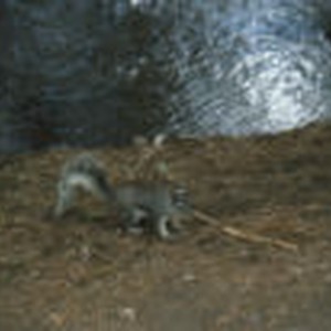 A grey squirrel walking on sticks and leaves in Frijoles Canyon.