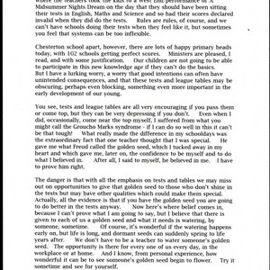 Thought for the day by Charles Handy on how education's emphasis on tests and other assessments is unfair to children who don't do well on them, and how a golden seed of promise and talent needs to be watered and nurtured inside both children and adults, December 9, 1999; Charles Handy Papers; Box 18, Folder 14; 1 page