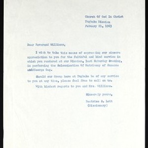 Beatrice S. Lott (Church of God in Christ), Tugbake Mission, [Liberia], letter, 1963 February 21, to Reverend Williams. [Description English/roman)]